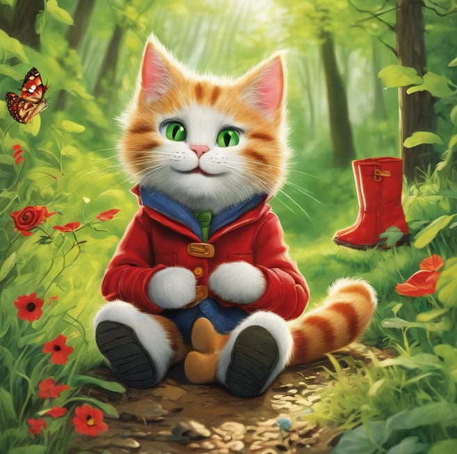 Apsiavė katinas batus, prisirišo prie diržo maišelį ir išėjo j mišką medžioti. Ten jis prisiskynė maišelį kiškio kopūstų, primaišė laukinių obuolių, o pats išsitiesė tarytum negyvas.
